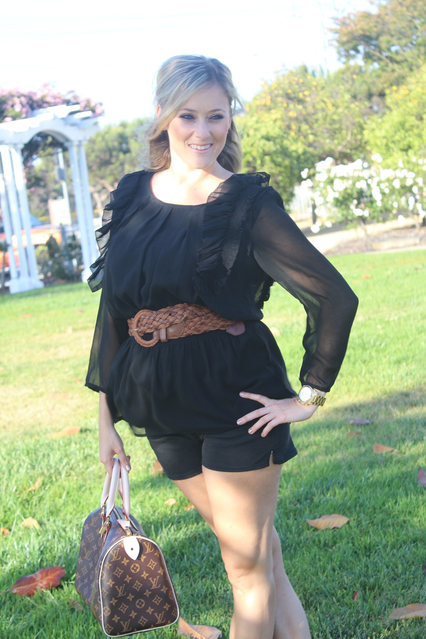 So black pretty much goes with any color in the world, right! A perfect combining color with black is a rich taupe or cognac color. I love how sophisticated this looks; it is a comfortable dressy outfit and perfect for a winery or shopping trip. This sheer blouse is from Forever 21 years ago, I like that it has ruffles, which I know he is not a fan of. But I like the way I can easily pair this with a skinny or chunky belt if I want. Today I did, with a thick brown wicker belt for an added summer touch. I paired it with a super soft pair of black shorts from Rich and Skinny Jeans. They are a great fit and will work year round in California. My main attraction were these Target Mossimo sandals I found for only $22.99 om sale online though. A steal and I really like the intricate detailing. They really pull together this whole look. My purse is the Speedy 25; it has a few brown tones and a whole lot of pretty to go with this look on this beautiful Friday! I curled my hair and pulled it half up and half down, it is a little windy but at least it stays out of my face. Wishing everyone a wonderful Holiday weekend!